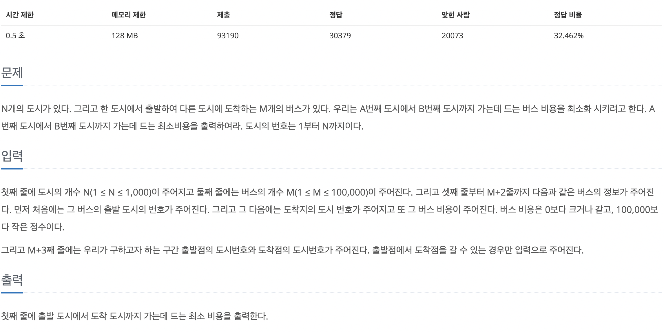 1. 백준 1916번 문제2. 다익스트라 알고리즘(Dijkstra’s Algorithm)1. 백준 1916번 문제 오늘도 알고리즘 공부를 위해 백준 문제에 도전했는데, 1916번 문제인 "최소비용 구하기"에 도전했습니다. 처음에는 간단하게 DFS를 이용하려 했지만, 최대 도시의 수가 100,000개로 주어지고 시간 제한이 0.5초라는 점을 고려하니 다른 접근 방식이 필요하다고 느꼈습니다. 문제에서 어떤 간선에는 큰 값이 들어갈 수도 있고 작은 값이 들어갈 수도 있다는 점을 고려하면, 결국에는 모든 경우를 탐색해야 한다고 생각했습니다. 그러나 시간 제한이 짧기 때문에 조건을 걸어주어 조기에 탐색을 종료할 수 있도록 백트래킹을 이용하여 코드를 작성했습니다. import syssys.setrecursionli..