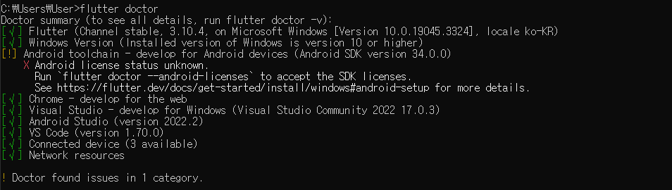 인터넷을 찾아보니 초기 셋팅에 사용했던 flutter doctor을 사용해보라고 해서 해봤더니 여기서도 오류가 발견 됐습니다.