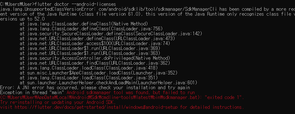 적혀있는대로 '--android-licenses'를 사용누르고 원래대로라면 yes를 누르고 바로 끝날 문제였는데 아래의 오류가 떠서 당황했습니다.
