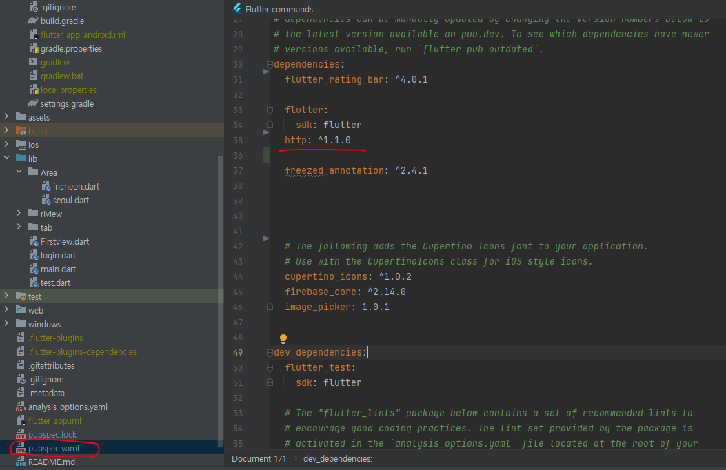 pubspec.yaml는 플로터 프로젝트를 생성하면 같이 생기는 기본 파일로 패키지 의존성 관리 및 프로젝트 정의 등의 다양한 역할을 수행하는 파일입니다. 그중에 dependencies는 패키지의 의존성을 작성하는 곳으로 주로 외부 패키지를 가져다 쓰기 위해 사용되는데 이곳에 http 패키지를 추가해줍니다. 그리고 AndroidManifest.xml 파일에서 인터넷 권한을 추가해줘야합니다.