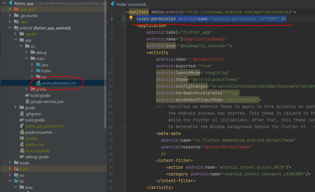 AndroidManifest.xml파일에 <uses-permission android:name="android.permission.INTERNET"/>을 작성해줌으로써 앱에 인터넷 권한이 추가됩니다. http 패키지는 import 'package:http/http.dart' as http; 형태로 작성함으로써 사용 가능합니다.