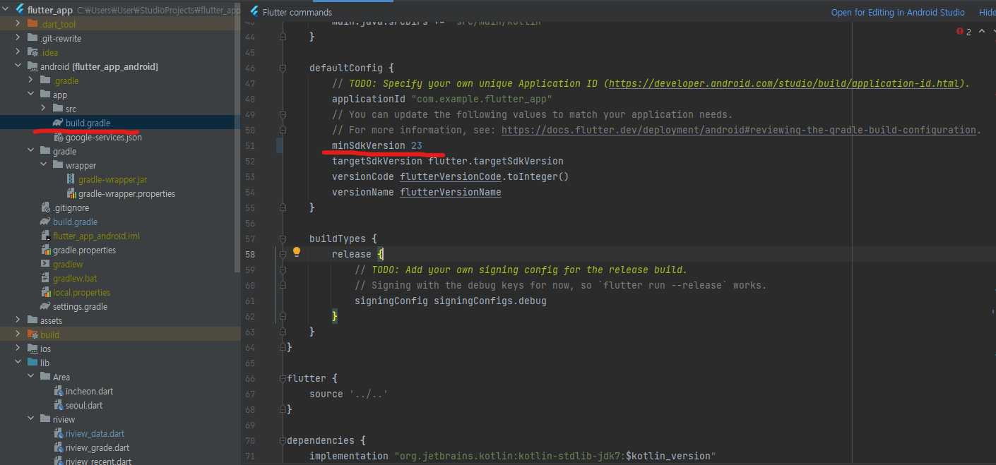 찾아보니까 flutter에서 빌드 시, 특정 라이브러리가 minsdk버전을 충족하지 못하면 위와 같은 에러가 발생하고 minSdkVersion을 올려야 한다는 사실을 알게되었습니다. 그래서 어디서 버전을 올릴 수 있나 하고 찾아봤는데