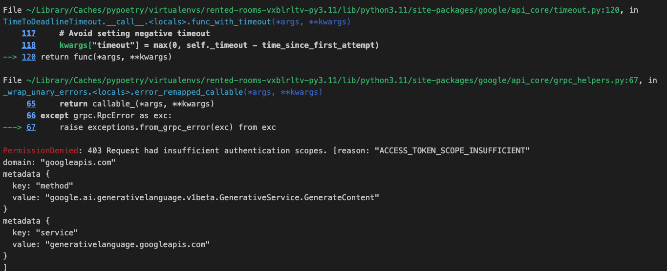 이 에러는 Google Generative AI API에 요청을 보낼 때 인증 토큰의 인증 스코프(authentication scope)가 불충분하기 때문에 발생한 것이었습니다. 찾아보니 Google Cloud는 프로젝트 단위로 리소스와 API 사용을 관리하기 때문에, Google Gemini API를 사용하려면 Google Cloud 프로젝트를 반드시 생성하고 지정해줘야했습니다. 현재 제가 지정한 프로젝트가 있는지 "gcloud config list"로 확인해보았고 지정된 프로젝트가 없는걸 확인할 수 있었습니다.