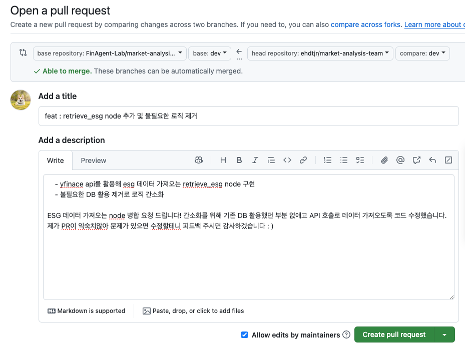 Push 후 PR 창을 들어가보니 위와같이 PR을 할 수 있는 이벤트가 생겼길래 이를 활용해 PR을 날려주었습니다.