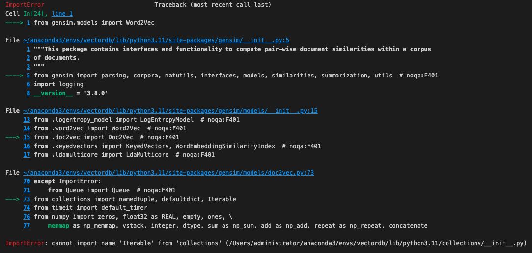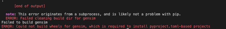 정상적으로 설치가 잘 되는가 싶었는데 이런 사진과 같은 에러가 발생했고 결국 원인을 다시 찾아보기로 했습니다. 그러다 python 버전을 바꿔가면서 가상환경을 만들어 사용하려는 gensim 패키지에 알맞은 python 버전을 찾으면 실행이 잘 되지 않을까? 라는 생각이 들었고 여러 버전을 바꿔가며 여러번 실행해 보았습니다. 마침내 gensim 3.4 and python 3.10.14 를 설치하니까 패키지가 정상적으로 설치 됐고 코드도 잘 작동하는 모습을 볼 수 있었습니다! 사실 gensim 패키지별 python 버전을 좀 열심히 찾아보면 인터넷에서 찾을 수 있을것 같았지만 이게 정확한 원인인지 확실하지 않고 이상하게 오기가 생겨서 혼자 해결하려고 했던 것 같습니다. 막상 해결하고나니 허무함이 남았지만 드디어 오류를 해결하고 강의 진도를 나갈 수 있다는 생각에 한편으로 좋았습니다 :)